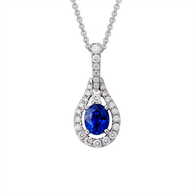14K White Gold Daimond And Sapphire Oval Shaped Pendant Necklace