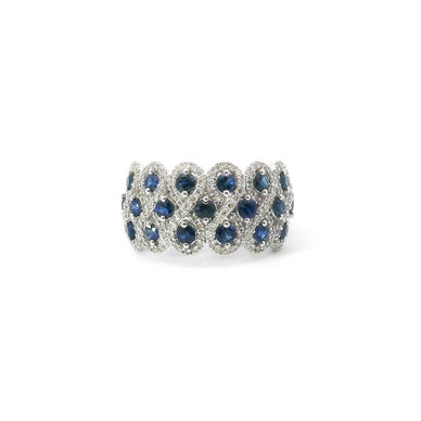 This 14K White Gold Fashion Ring Showcases A Stunning Infinity-Inspired Motif, Brought To Life With The Deep, Velvety Brilliance Of 1 Ctw Blue Sapphires. Each Sapphire Is Framed By A Delicate Halo Of Sparkling Diamonds—Totaling 5/8 Ctw—Creating A Luminous Contrast That Enhances The Ring’S Dimensional, Luxurious Look. The Intricate Looping Pattern Symbolizes Everlasting Elegance, Making This Wide-Band Design Both Meaningful And Undeniably Eye-Catching. Perfect For Sapphire Lovers, Milestone Gifting, Or Adding A Bold Pop Of Color To Any Fine Jewelry Collection. Style Number WHR216150SA