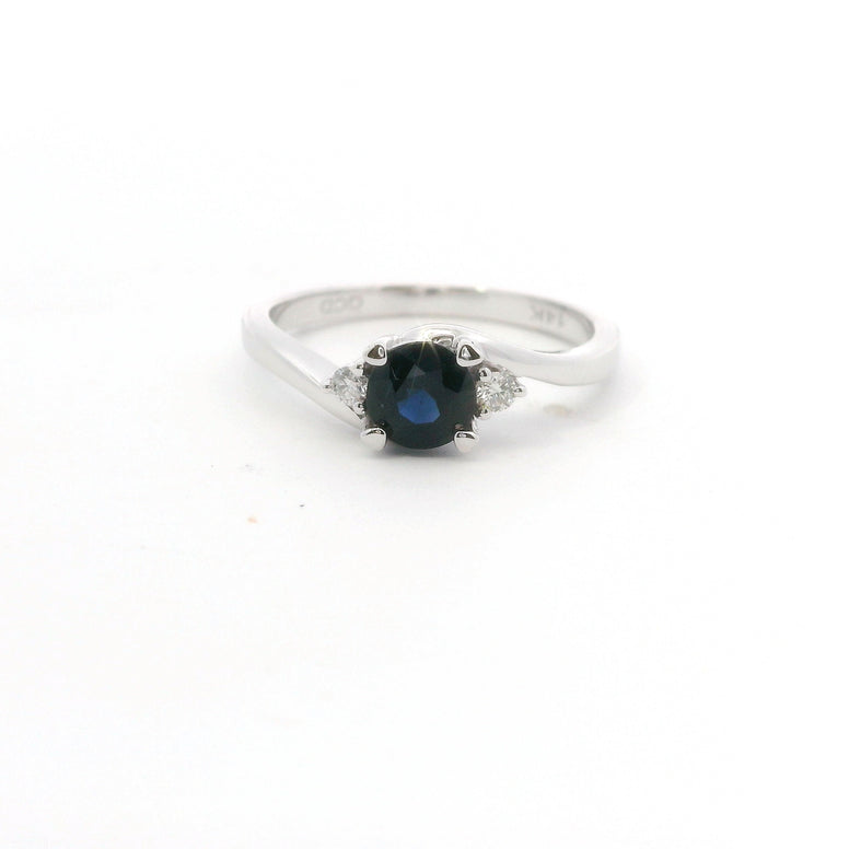 Classic Elegance Meets Timeless Design In This 14K White Gold Sapphire And Diamond Ring. At The Center Lies A Captivating 0.70 Carat Round-Cut Sapphire, Radiating A Deep, Velvety Blue Hue That Symbolizes Loyalty, Wisdom, And Enduring Love. Flanking The Center Gemstone Are Two Sparkling Round Brilliant Diamonds Totaling 0.06 Carats, Adding Just The Right Amount Of Brilliance And Contrast To Highlight The Sapphire’S Regal Tone. Crafted In Polished 14K White Gold, The Graceful Setting Features A Subtle Twist Along The Shank, Giving The Ring A Modern, Feminine Touch While Maintaining Its Timeless Charm. The Refined Simplicity Of The Design Allows The Gemstones To Take Center Stage, Making It A Versatile Piece Perfect For Both Everyday Wear And Special Occasions. Style Number JR0660SAW