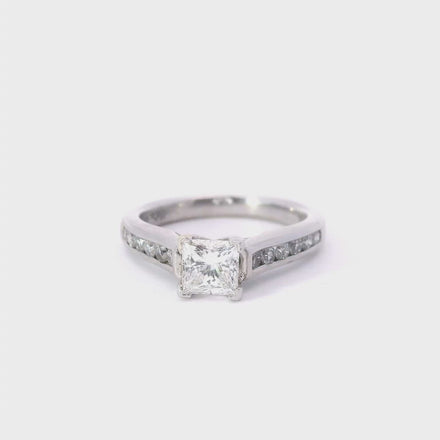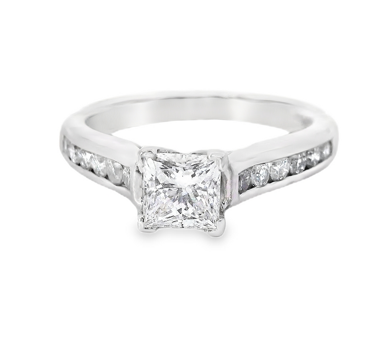 This stunning 14K white gold semi-mount engagement ring holds s a brilliant .77 ctw princess-cut diamond set in a sleek platinum band that features 12 round .35 cttw side diamonds. The side stones add an extra touch of sparkle, making it a perfect symbol of everlasting love and commitment. Center stone sold separate. The center diamond that is pictured is a .77 ctw F SI2 EGL certified earth mined princess cut diamond (190-00005) and can be added to this setting for an additional $5,100 or you can choose your own lab grown or earth mined diamond to pair with this beautiful setting. Style Number W-ER3963D4