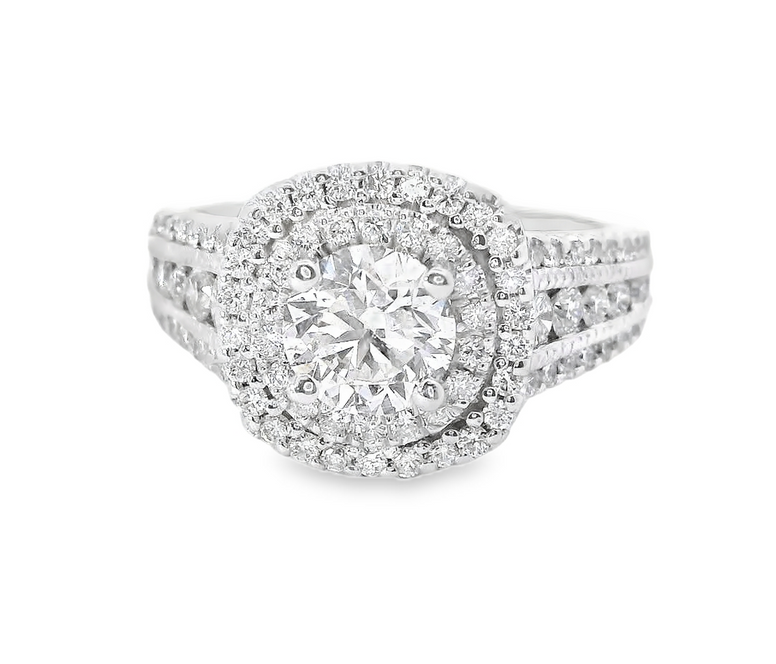 This Exquisite Double Halo Diamond Ring Holds A Stunning Center .90 ctw Round Cut Diamond H Si2 Gia Certified Diamond Surrounded By .85 cttw Halo Of Smaller Diamonds, Set On A Beautifully Crafted Band. Perfect For Engagements Or Special Occasions, Its Timeless Elegance And Sparkling Brilliance Make It A Cherished Piece. The Center Earth Mined Diamond (190-00013) Is Sold Separate And Can Be Added To This Beautiful Setting For An Additional $8,575 Or You Can Add Your Own Lab Grown Or Earth Mined Diamond. Style Number ER11760