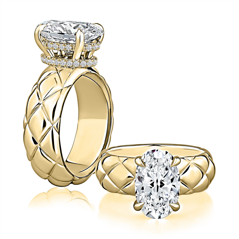 Elevate Your Love Story With The A.JAFFE 14K Yellow Gold Halo Semi-Mount Engagement Ring, Featuring A Stunning 0.19 CTW G SI Diamond Band That Beautifully Complements The Exquisite Quilting Pattern Trademarked By A.JAFFE. This Elegant Setting Is Designed To Hold A 3 CT Oval-Shaped Diamond Of Your Choice, Allowing You To Personalize Your Ring With A Center Stone That Reflects Your Unique Style. Please Note That The Center Stone Is Not Included With This Purchase But Is Available Upon Request, Making This Ring A Perfect Canvas For Your Dream Diamond.