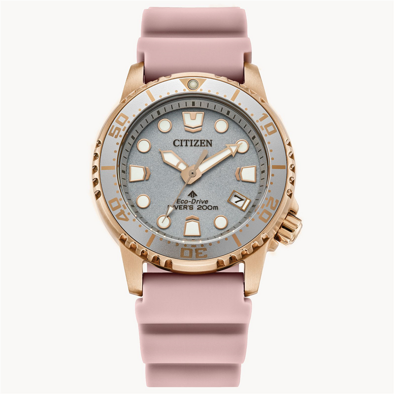 Rose Gold-Tone Stainless Steel Case With A Pink Polyurethane Strap. Uni-Directional Rotating Rose Gold-Tone Stainless Steel Bezel. Silver Dial With Rose Gold-Tone Hands And Index Hour Markers. Minute Markers Around The Outer Rim. Dial Type: Analog. Luminescent Hands And Markers. Date Display At The 4 O'clock Position. Citizen Caliber Eco-Drive E168 Eco-Drive Movement. Scratch Resistant Mineral Crystal. Screw Down Crown. Solid Case Back. Round Case Shape, Case Size: 36.5 mm. Band Width: 18 Mm. Buckle Clasp. Water Resistant At 200 Meters / 660 Feet. Functions: Date, Hour, Minute, Second, Solar-Powered. Promaster Series. Dive Watch Style. Watch Label: Japan Movt. Citizen Promaster Silver Dial Ladies Watch EO2023-00A.