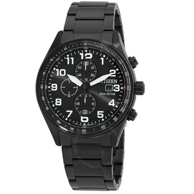Black Stainless Steel Case And Bracelet. Fixed Black Bezel. Black Dial With Arabic Numeral Hour Markers. Minute Markers Around The Outer Rim,Tachymeter Scale. Dial Type: Analog. Luminescent Hands And Markers. Date Display At The 3 O' Clock Position. Chronograph - Three Sub-Dials Displaying: 60 Second, 60 Minute And 24 Hour. Citizen Caliber Eco-Drive B612 Eco-Drive Movement. Scratch Resistant Mineral Crystal. Pull / Push Crown. Solid Case Back. Round Case Shape, Case Size: 43 mm. Fold Over Clasp With A Safety Release. Water Resistant At 100 Meters / 330 Feet. Functions: Chronograph, Date, Hour, Minute, Second. Sport Watch Style. Style Number CA0775-52F