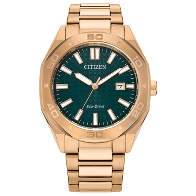 Confidently Go From Work To Play With The New Weekender Sport. Featuring A Rose Gold-Tone Stainless Steel Case Measuring 41mm In Diameter, The Sports-Focused Timepiece Makes Use Of Sharp Lines And Contrasting Styling To Make A Statement On The Wrist. A Faceted 60-Minute Bezel, H-Link Bracelet, And 100M Water Resistance Ensure All-Purpose Wear. On The Dial, A Textured Green Display Is Presented, With Applied Indices In Bright White Alongside A 3 O'clock Date Window Providing High Legibility And Daily Utility. Featuring Citizen's Eco-Drive Technology, Sustainably Powered By Any Light And Never Needs A Battery. Caliber Number E111. Style Number BM7633-81X