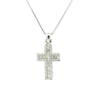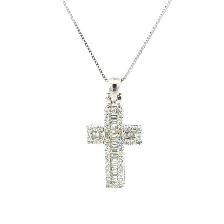 Elevate your style with our exquisite 14K White Gold and diamond cross pendant. Crafted with precision, This pendant showcases a total weight of 0.27 CT in brilliant white diamonds and 0.29 CT in dazzling baguette diamonds. The combination of high-quality materials and intricate design results in a stunning piece that exudes elegance and sophistication. Wear it as a symbol of faith or simply as A statement of your unique sense of style. Whatever the occasion, our diamond cross pendant necklace is sure to leave a lasting impression. Style Number SDB1286-333