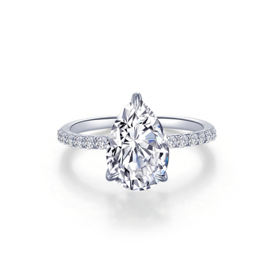 A Timeless Classic. This Shimmering Pear-Shaped Solitaire Ring Features Lafonn's Signature Simulated Diamond Artistically Held In The Center By Three Claw Prongs, With 14 Smaller Round Simulated Diamonds Adorning The Band To Complete The Look. The Ring Is In Sterling Silver Bonded With Platinum. Style Number R0483cCLP06