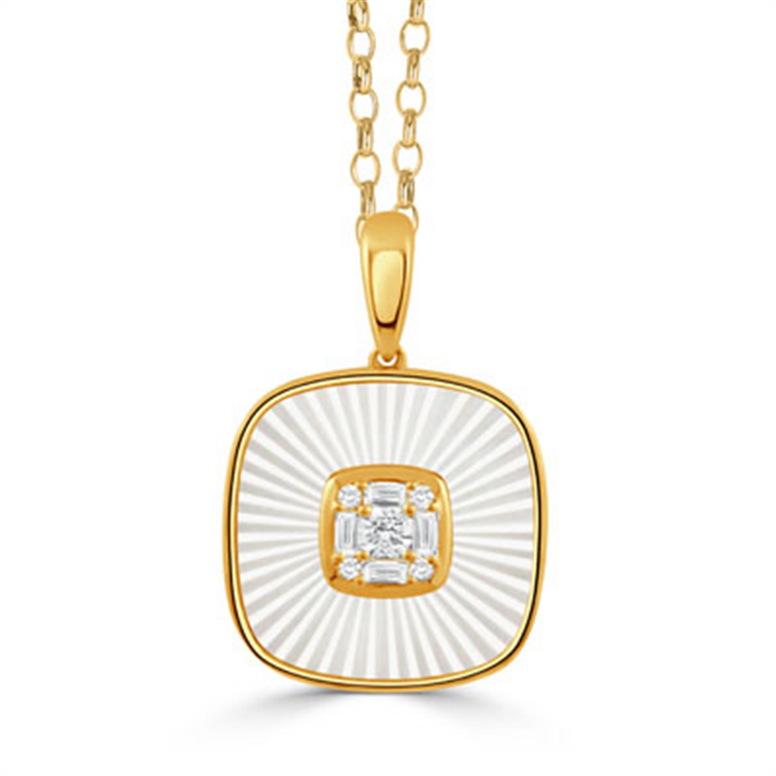 Elegant And Timeless, This 18K Yellow Gold Pendant Necklace Features A Stunning Combination Of Materials And Craftsmanship. At Its Center, Invisible-Set Baguette And 0.20 CT Round Diamonds Form A Radiant Cluster That Captures The Light From Every Angle. Surrounding The Diamonds Is A Beautifully Carved White 2.10 CT Mother-Of-Pearl Inlay With A Sunburst Texture That Adds Depth And Shimmer To The Design. The Pendant Is Framed In Rich 18K Yellow Gold, Creating A Striking Contrast Between The Luminous Pearl And Warm Gold Tones. Suspended From An 18-Inch Oval Link Yellow Gold Chain, This Piece Is The Perfect Blend Of Sophistication And Everyday Elegance. Style Number P12245WMP-A