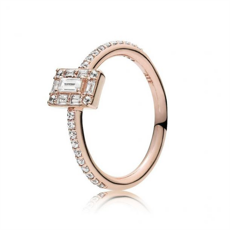 From Pandora, Go From Work To Play In Style With This Classic Ring In Blush-Pink 14K Rose Gold-Plated Sterling Silver. The Glittering Piece Is Detailed With A Baguette-Cut Center Stone Surrounded By A Halo Of Smaller Stones.