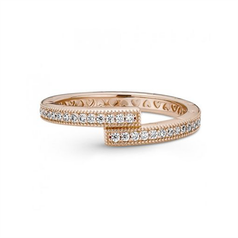 Opt For Modern Minimalism With The Sparkling Overlapping Ring. This Hand-Finished, 14K Rose Gold-Plated Ring Features An Asymmetrical Design Where The Square Ends Of The Band Slightly Overlap To Create 90-Degree Angles. The Outer Band Features Clear Cubic Zirconia Pavé Framed By Micro-Beading, The Sides Have The Pandora Logo And The Inner Shank Has Cut-Out Hearts. There Are Two Pandora Crown O Monograms At The End Of Each Profile. Subtly Stunning On Its Own Or Show-Stopping When Multiple Are Stacked Together, This Ring Makes A Clean, Chic Statement. Style Number 189491C01-52
