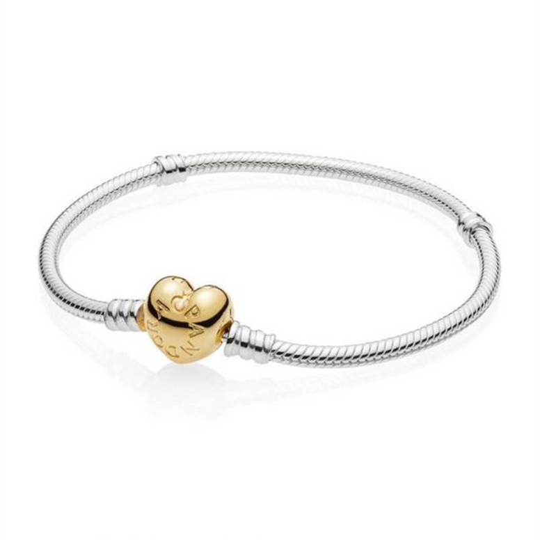 A Golden Touch Is Added To The Classic Pandora Moments Bracelet Collection With This Sterling Silver And A 14K Gold-Plated Unique Metal Blend Bracelet. A Sterling Silver Bracelet Is Accentuated With A Yellow Gold-Tone Heart Clasp. Use It As A Lovely Carrier For Your Personal Charms. This Bracelet Measures 6.3 Inches In Length.