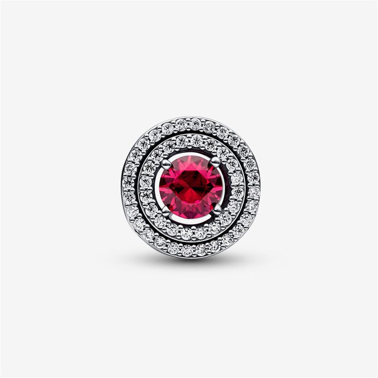 Bring A Sophisticated Touch Of Color To Your Jewelry With The Red Sparkling Leveled Round Charm. Crafted From Sterling Silver, Each Side Of The Charm Features A Round, Brilliant-Cut, Man-Made Crystal At The Center, Outlined By Two Rows Of Clear Cubic Zirconia Pavé. A Cut-Out Heart Pattern Features On The Sides. Style This Piece On Your Go-To Pandora Moments Bracelet To Make A Sparkling Statement.
