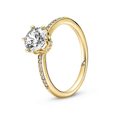 Tap Into Shining Elegance With The Clear Sparkling Crown Solitaire Ring. This Solitaire Ring, Hand-Finished In 14K Gold-Plated Metal, Features A Large Clear Cubic Zirconia Center Stone Set In A Crown-Shaped Claw Setting. The Setting, As Well As The Ring Shank, Are Embellished With Clear Cubic Zirconia Stones, Making The Ring Shine Even Brighter. Inspired By The Look Of A Regal Crown, This Ring Will Bring A Royal Touch To Any Outfit. Style Number 168289C01-52