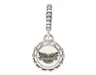 The Custom Thunderbirds Dangle Charm Is A Tribute To The Local Winston- Salem Minor League Professional Hockey Team. Show Your Thunderbird Pride With This Charm Crafted From Sterling Silver. This Disc-Shaped Charm Featuring The Team Logo On Both Sides Complete With A Pattern Of Hearts Adding Detail Around The Edges Is A Meaningful Gift For The Thunderbird Fan In Your Life. While Supplies Last.