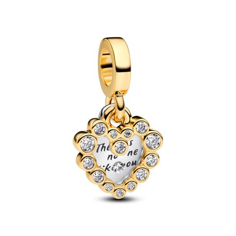Make Your Feelings Known With The Sparkling Heart Double Dangle Charm. Featuring Sterling Silver And 14K Gold Plating, This Two-Toned Charm Has Two Separate Heart-Shaped Dangles. Sparkling Stones Form A Border Around The Front Dangle, With A Floating Stone At Centre Set In Transparent Resin. The Back Dangle Reads "There Is No One Like You." Inspired By Motherhood In All Its Multifaceted Expressions, This Charm Celebrates The Power Of A Mother's Love.