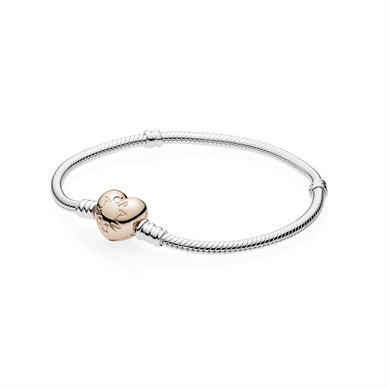 Set Your Heart A-Flutter With This Romantic Version Of Pandora's Bestselling Charm Bracelet. Hand-Finished With A 14K Rose Gold-Plated Heart-Shaped Clasp, This Sterling Silver Moments Heart & Snake Chain Bracelet Looks Stunning On Its Own But Even Better Adorned With Your Favourite Pandora Moments Charms And Clips. Layer It With Contrasting Pandora Chain Bracelets For A Chic, Multi-Layered Look. This Bracelet Measures 7.5 Inches In Length.