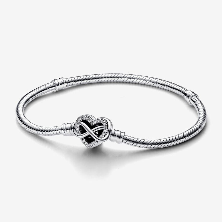 Representing The Eternal Love That Binds Family Together, The Pandora Moments Sparkling Infinity Heart Clasp Snake Chain Bracelet Is A Meaningful Gift For The Ones That Matter Most To You. The Openwork Heart Clasp Features Stones Along The Edge And An Asymmetrical Infinity Symbol Entwining Around The Heart. The Back Of The Clasp Is Engraved With The Message "Family Forever And Always". The Bracelet Features Two Threaders (Raised Charm Dividers) Dividing It Into Three Sections. Style It With Up To 16-18 Of Your Favorite Charms Or Dangle Charms To Symbolize The Ones You Love, Or Gift It To Someone Close To Your Heart. This Bracelet Measures 7.5 Inches In Length. Style Number 592645C01-19