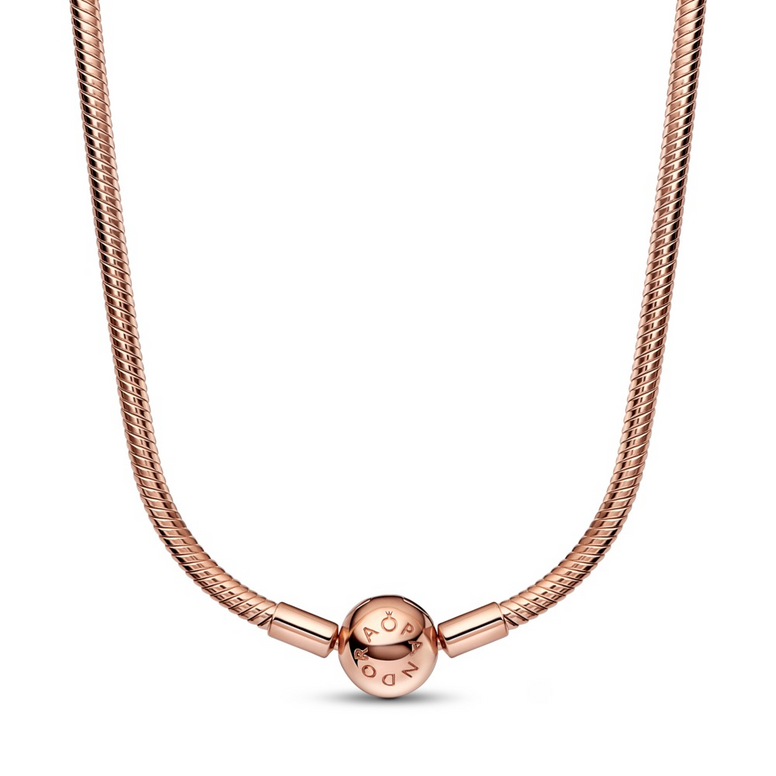 Say Hello To Your New Jewelry Box Staple With The Pandora Moments Snake Chain Necklace. Hand-Finished With 14K Rose Gold Plating, This Simple Yet Elegant Design Features Pandora’S Iconic Snake Chain Pattern And A Ball Clasp Embossed With The Pandora Logo. Wear It On Its Own Or Style With A Pandora O Pendant And Keep Your Favourite Charms Close To Your Heart. This Necklace Measures 19.7 Inches In Length.
