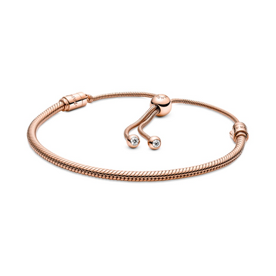 This Stunning Pandora Moments Snake Chain Slider Bracelet Is A Sophisticated Spin On The Classic Friendship Bracelet. Hand-Finished And 14K Rose Gold-Plated, It Features One Fixed And One Movable End Cap — Both Set With Shimmering Stones. An Innovative Sliding Clasp Makes It Easy To Adjust It To Your Size. The Perfect Present For Friends And Loved Ones, It Can Be Styled By Lifting The Movable End Cap And Adding Your Favorite Pandora Charms. The Lobster Clasp And Jump Ring Are Made From Sterling Silver Plated With 14K Rose Gold. This Bracelet Measures 6.3 Inches In Length. Style Number 589652C01-2