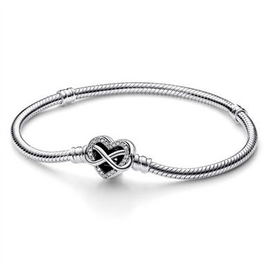 Representing The Eternal Love That Binds Family Together, The Pandora Moments Sparkling Infinity Heart Clasp Snake Chain Bracelet Is A Meaningful Gift For The Ones That Matter Most To You. The Openwork Heart Clasp Features Stones Along The Edge And An Asymmetrical Infinity Symbol Entwining Around The Heart. The Back Of The Clasp Is Engraved With The Message "Family Forever And Always". The Bracelet Features Two Threaders (Raised Charm Dividers) Dividing It Into Three Sections. Style It With Up To 16-18 Of Your Favorite Charms Or Dangle Charms To Symbolize The Ones You Love, Or Gift It To Someone Close To Your Heart. Style Number 592645C01-16