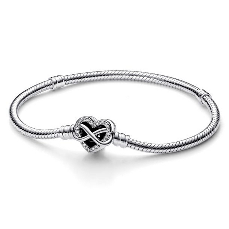 Representing The Eternal Love That Binds Family Together, The Pandora Moments Sparkling Infinity Heart Clasp Snake Chain Bracelet Is A Meaningful Gift For The Ones That Matter Most To You. The Openwork Heart Clasp Features Stones Along The Edge And An Asymmetrical Infinity Symbol Entwining Around The Heart. The Back Of The Clasp Is Engraved With The Message "Family Forever And Always". The Bracelet Features Two Threaders (Raised Charm Dividers) Dividing It Into Three Sections. Style It With Up To 16-18 Of Your Favorite Charms Or Dangle Charms To Symbolize The Ones You Love, Or Gift It To Someone Close To Your Heart. This Bracelet Measures 7.1 Inches In Length.