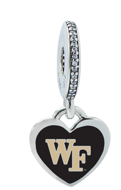 Show Your School Pride With This Exclusive Pandora X Wake Forest University Heart Dangle Charm — Available Only At Hannoush Jewelers. Hand-Finished In Sterling Silver, This Officially Licensed Charm Features The Iconic Wake Forest “Wf” Logo On One Side And “Wake Forest” On The Reverse, Both Accented In The University’S Signature Black And Gold Enamel. A Row Of Sparkling Clear Cubic Zirconia Lines The Bale, Adding The Perfect Touch Of Elegance And Shine. This Meaningful Piece Is A Must-Have For Fans, Students, And Alumni Alike — A Stylish Way To Carry Your Demon Deacon Spirit Wherever You Go. Style Number EG792017CZ-10997
