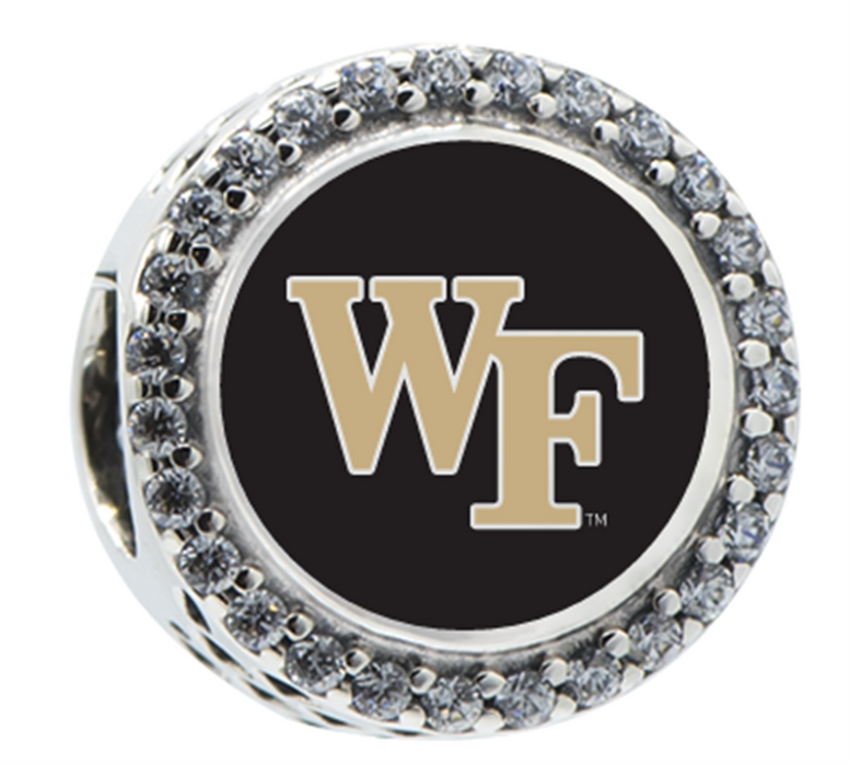 Show Off Your Demon Deacon Pride With This Exclusive Pandora X Wake Forest University Logo Button Charm — Available Only At Hannoush Jewelers. Crafted In Sterling Silver And Framed By A Sparkling Halo Of Clear Cubic Zirconia, This Officially Licensed Charm Features The Iconic Wake Forest “Wf” Logo In Rich Black And Gold Enamel On One Side And “Wake Forest” On The Reverse. Perfect For Alumni, Fans, And Students Alike, This Elegant Two-Sided Charm Brings School Spirit And Timeless Shine To Any Pandora Bracelet Or Necklace. Style Number EG798747C01-10995
