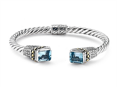 Our Sterling Silver 18K Solid Gold Twisted Emerald Cut Blue Topaz Hinged Bangle, Handcrafted In Bali By Our Skilled Artisans. From Our Signature Collection, Royal Bali™ Featuring Designs Handcrafted Using Sterling Silver, Solid 18K Gold Accents And Genuine Gemstones. The November Birthstone, Topaz, Symbolizes Love And Affection. It Is Believed To Give The Wearer Increased Strength And Intellect. Style Number 58857BA.BT