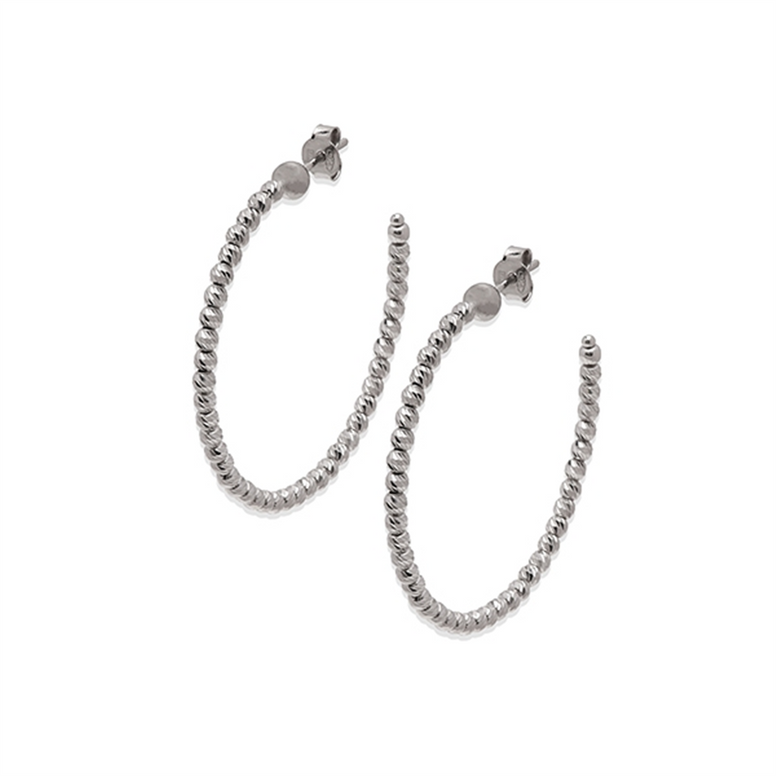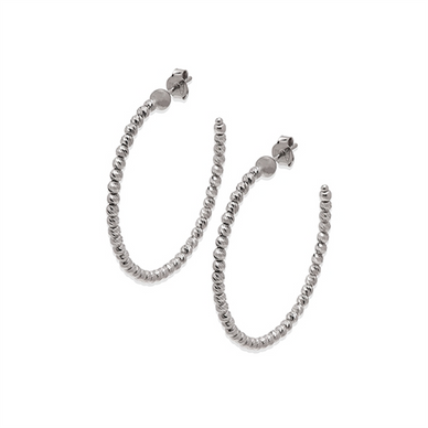 Show Off Your Style With These 35mm Desmos Diamond-Cut Hoop Earrings. Crafted From High-Shine Sterling Silver With Rhodium Plating,These Eye-Catching Earrings Feature A Sparkling Diamond-Cut Finish. Add A Touch Of Glamour To Your Look! Made In Italy. Available In Other Metal Options.