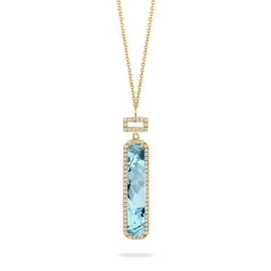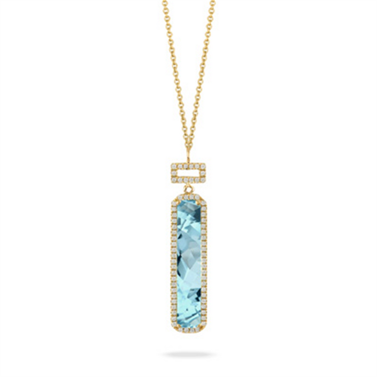 This Stunning 18K Yellow Gold Drop Pendant Necklace Showcases A Brilliant 2.63 Ct Sky Blue Topaz Accented By 66 Round Diamonds Totaling 0.15 Ctw. The Elongated Design Is Framed In A Delicate Diamond Halo That Enhances The Gemstone’S Vibrant Hue And Shimmer. Hanging From An 18" Chain, This Piece Blends Modern Elegance With Timeless Luxury — The Perfect Statement Of Color And Sophistication. Style Number N10135BT-Y