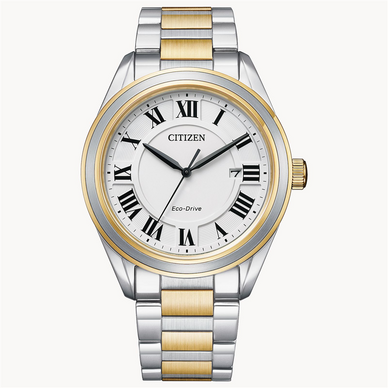 From Citizen Eco-Drive, The Arezzo Two-Tone Men’S Watch Is A Modern Take On A Classic Style. It Features A Two-Tone Bracelet Band, And Is Paired With A White Dial And Bold Black Roman Numeral Markers. The Three-Hand Watch Also Shows The Current Date, And It Is Sustainably Powered By Light With Citizen’S Eco-Drive Technology. This Is A Perfect Blend Of Modern Style Paired With Classic Details For A Unique Watch That Will Become A Favorite In Every Collection.