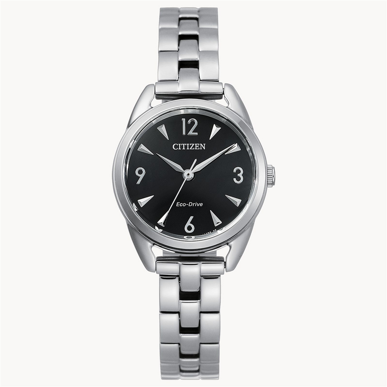 For A Slimmer Version Of The Classic Ladies’ Drive Watch From Citizen, This Timepiece Still Packs All The Features You Would Expect Into A Smaller Profile, Including Patented Eco-Drive Technology, Powered By Light. The Stainless-Steel Band And Black Face Are Offset With A Silver Three-Hand Dial And Easy-To-Read Numerals, Making It As Practical As It Is Beautiful.