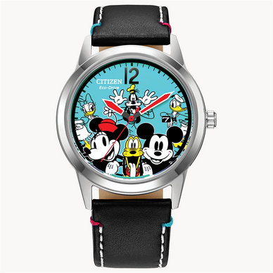 Citizen’S Disney Sensational Six Timepiece Features Some Of Disney’S Most Recognized Characters: Mickey Mouse, Minnie Mouse, Donald Duck, Daisy Duck, Goofy And Pluto. This Unisex Watch Features Exclusive Artwork That Captures The Essence Of Their Fun-Loving Personalities. The Disney Watch Features A Black Leather Band With Contrast Stitching To Match The Dial And Is Sustainably Powered By Light With Citizen’S Eco-Drive Technology. ©Disney