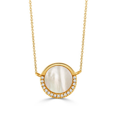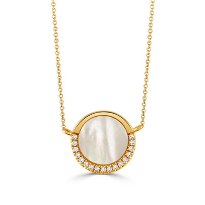 This Elegant 18K Yellow Gold Pendant Necklace Features A Luminous 0.36 Ct Mother Of Pearl Center Framed By A Delicate Halo Of Sparkling Round Diamonds Totaling 0.04 Ct. Suspended From An 18-Inch Chain, This Timeless Piece Captures Both Classic Beauty And Modern Sophistication. The Warm Gold Perfectly Complements The Soft Iridescence Of The Mother Of Pearl, Creating A Radiant Everyday Luxury Look That Transitions Effortlessly From Day To Evening.