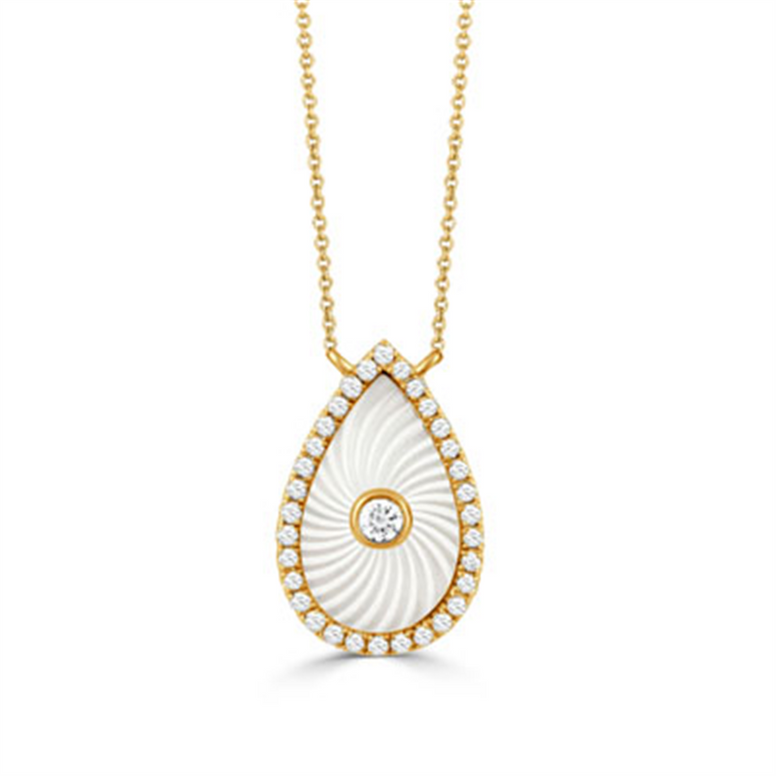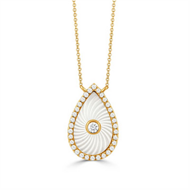 Graceful And Luminous, This 18K Yellow Gold Teardrop Pendant Necklace Combines Classic Elegance With A Modern Touch. The Pendant Features A 0.70 Ct Carved White Mother-Of-Pearl Inlay, Creating A Soft Iridescent Glow That’S Beautifully Accented By A Sparkling 0.40 Ct Halo Of Round Diamonds. At The Center, A Single Bezel-Set Diamond Adds A Refined Focal Point, Enhancing The Pendant’S Radiant Design. The Piece Is Finished With An 18-Inch 18K Yellow Gold Chain, Offering The Perfect Balance Of Sophistication And Versatility. Whether Worn Daily Or For A Special Occasion, This Necklace Adds A Touch Of Effortless Luxury To Any Look. Style Number N11966WMP-B