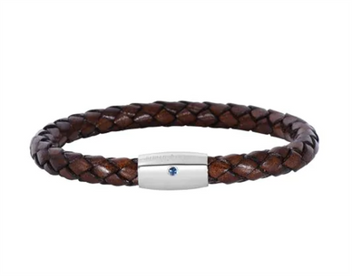 Woven Brown Cow Leather Bracelet With Sapphire And Sterling Silver Barrel Clasp 8"